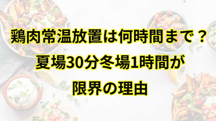 鶏肉の常温放置は、夏場で30分、冬場でも1時間が限界 です。牛肉や豚肉と違い、鶏肉は非常に傷みやすく、食中毒のリスクが高いため、シビアに判断する必要があります。
